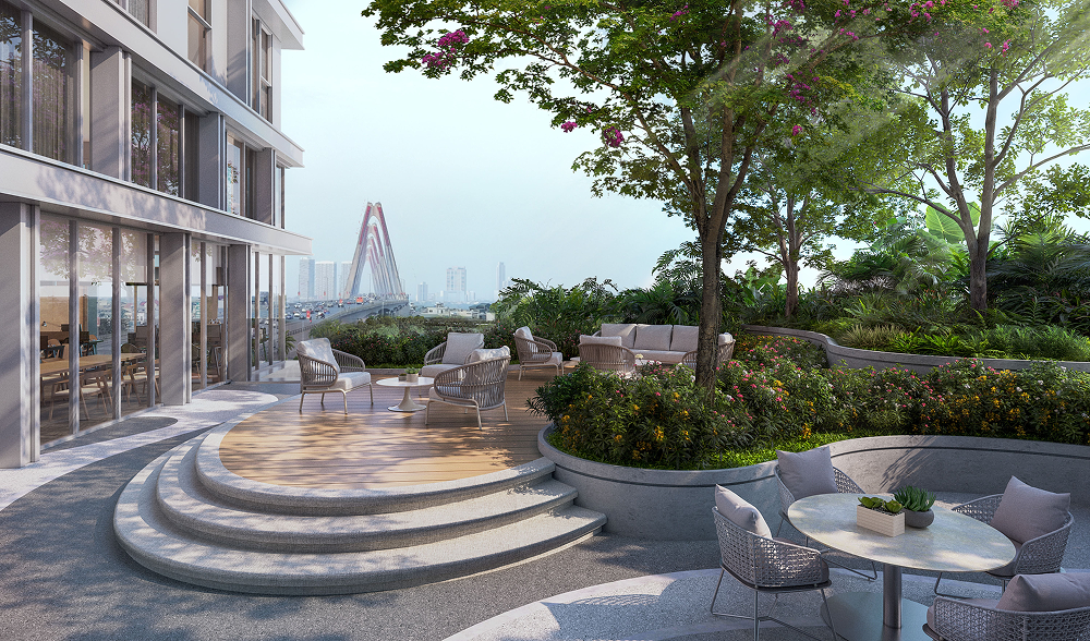 Khu vườn trên cao nằm giữa hai cánh tháp, đón trọn những luồng gió tự nhiên và lan tỏa nguồn sinh khí trong lành khắp không gian. Tại đây, cảnh quan và kiến trúc hòa quyện như một dòng chảy mềm mại, kết nối không gian trong – ngoài một cách đầy tinh tế.